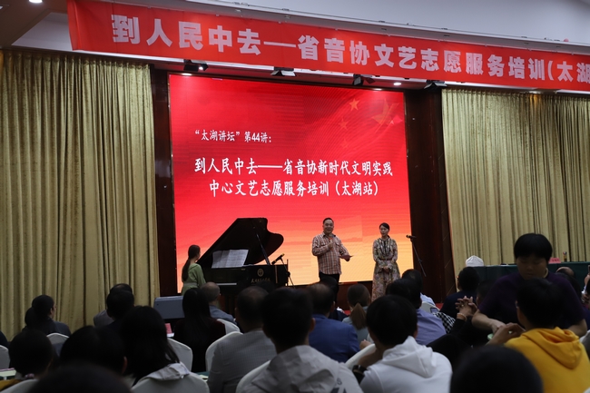 10月22日,“到人民中去——省音协文艺志愿服务培训(太湖县站)”活动在太湖县举行。由省文联副主席、省音协主席盘龙,省音协副主席、安徽艺术职业学院音乐学院院长、教授邝实,省音协副主席、秘书长徐海燕组成的文艺志愿者服务小分队走进太湖,为当地送去了一堂别开生面的声乐专题讲座。当地县委、市文联、县文旅体局、教育局负责人及200名余艺术工作者和爱好者聆听了本次的讲座。