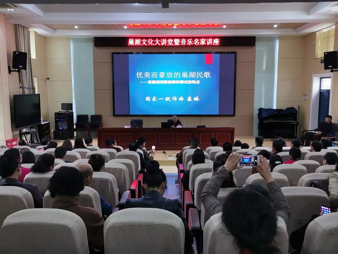 主讲人一级作曲崔琳老师,就巢湖民歌旋律和调式的特点方面作了深入浅出地分析和阐述,并通过与周边地区民歌特点作对比的方式,充分展示出了巢湖民歌的独特魅力。