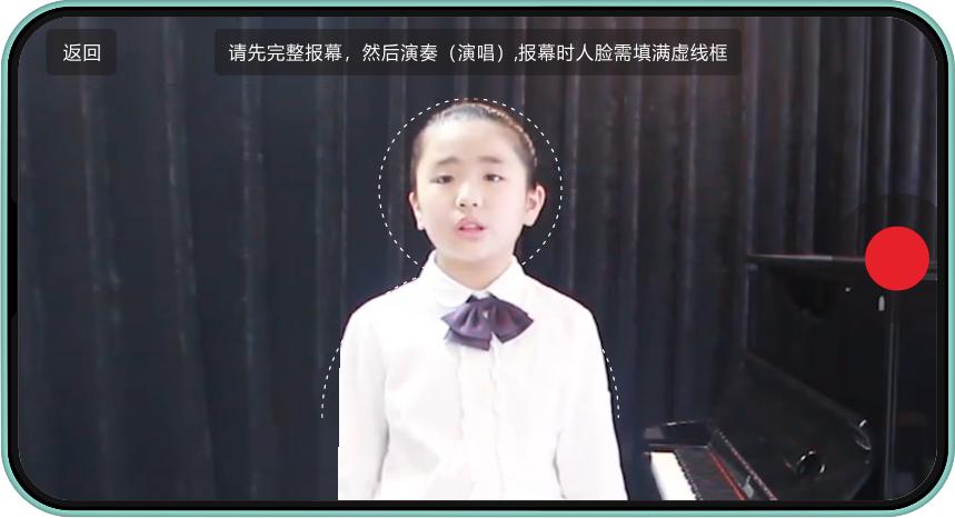 5、报幕要求:考生在开始录制视频前,必须正面朝摄像手机或平板智能终端报幕,需要将人脸完整填充拍摄界面的人形框,以便实现电脑人脸识别,清晰报出本人姓名、专业、级别后,开始录制。