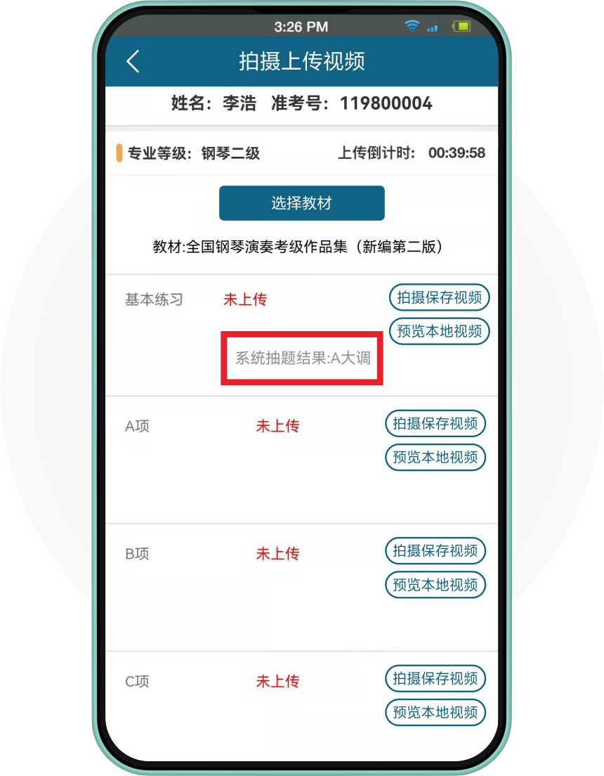 在拍摄上传视频前,先选择教材,如果报考的专业有基本练习或者视奏,请根据系统的提示先抽取曲谱,再开始拍摄上传视频。进入拍摄上传视频界面,系统将会开始上传倒计时,请在规定时间内完成所有项目的拍摄上传。