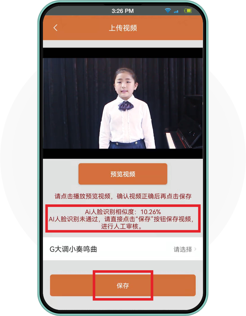 点击“开始”按钮,考生正面朝摄像手机报幕,需要将人脸完整填充拍摄界面的人形框,以便实现电脑人脸识别,清晰报出本人姓名、专业、级别后,开始演奏曲目。