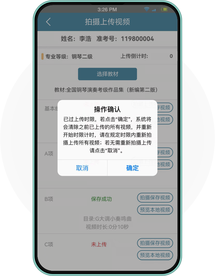 考生在规定时限内,没有完成所有考级项目视频的拍摄并保存,也没有点击“全部保存成功确认上传”按钮,进行确认。最后状态将显示为“考级视频上传未能完成”。
